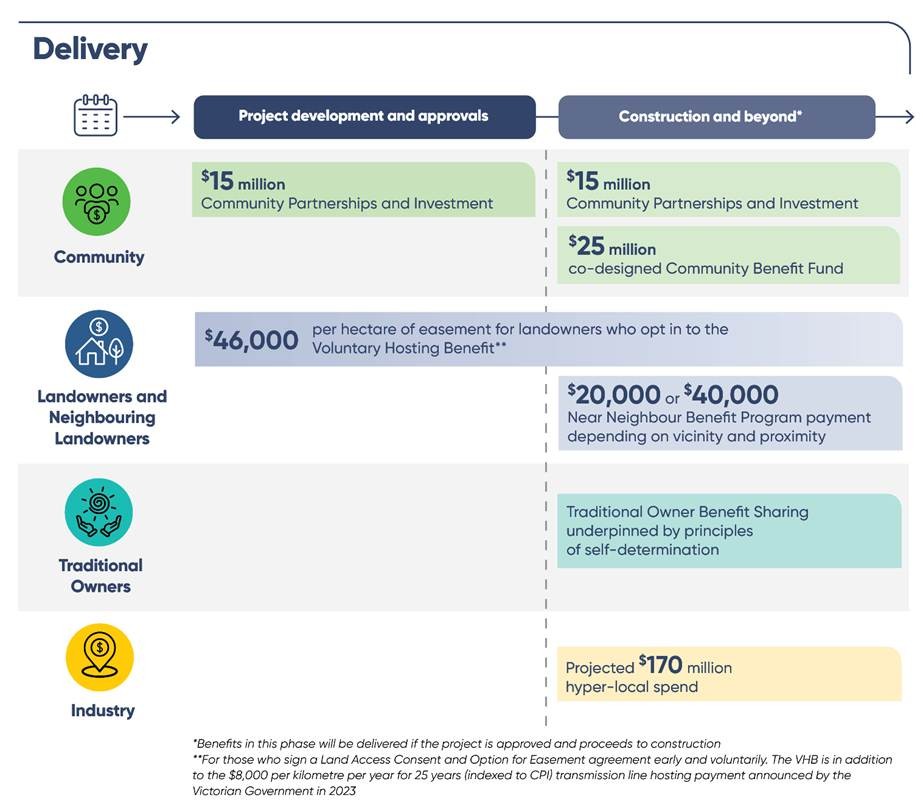 The funding announced today is in addition to the Voluntary Hosting Benefit for landowners of $46,000 per hectare of easement hosted on their properties. The hosting benefit recognises the critical role that host landholders play in the energy transition and is in addition to the $8,000 per kilometre per year for 25 years (indexed to CPI) transmission line hosting payment announced by the Victorian Government in 2023. These payments are also separate from the legally required compensation for host landowners, which ensures they are fully compensated for any impacts to their properties and farming operations.