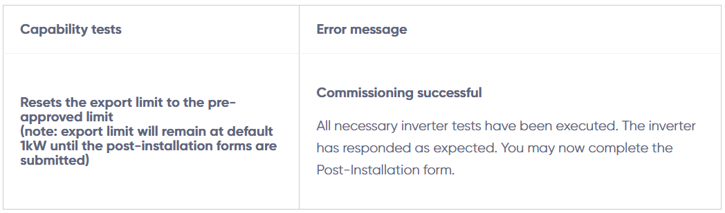 - The customer’s device will move from the default 1kW export to the allowable export limit once the post-installation form is submitted. Check the correct export limit is submitted as this is the limit sent to the customer’s device.